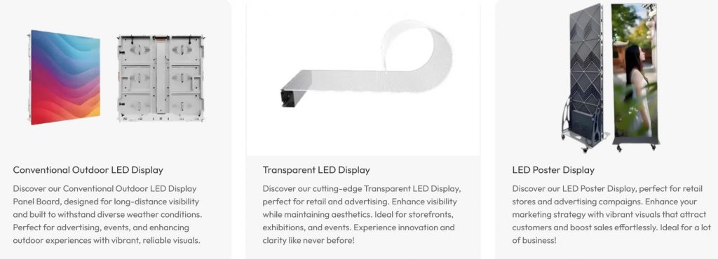 Home CUSTOM LED DISPLAY SERVICES Send us a message:请在浏览器中启用JavaScript来完成此表单。请在浏览器中启用JavaScript来完成此表单。NamePlease tell me your name. It's not neccessary if you want to save time.Email *Please input your email address. You'll get response by email. By the way, ignore the notice by "!" after you finish inputting.Choose an option: Outdoor led display 4500-6000cdCustomized brightness led displayIndoor led display 300-1000cdTransparent film led displayTransparent grid led displayOLED Transparent displayExhibition led displayInteractive led displayLed IposterChoose an led display type you want to know more or your detail requirement. We'll support you a suitable solution.Send us a message:Please decription where you would like to use by the display. If you have no idea, please tell us the detail information of your site and usage. We'll design a customized solution for you. Send